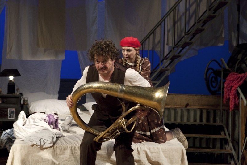 На сцената са опънати три реда изпрани чаршафи, от ложите висят простори с кюлоти, Камен Донев пържи яйца, а три перални ритмично препират прането. Дааа, животът е прекрасен. Макар и началото да не е много обнадеждаващо.