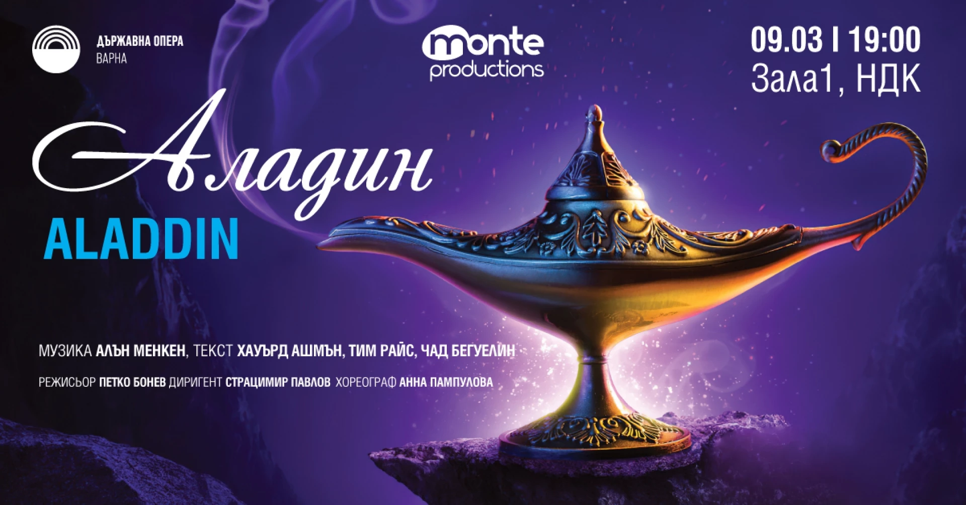 На 9 март на сцената на Зала 1 на НДК ще излязат над 80 артисти – солисти, ансамбъл, балет и оркестър. В центъра на историята са бедният, находчив Аладин в изпълнение на Георги Георгиев, свободолюбивата принцеса Жасмин – Кристияна Атанасова, неудържимият и остроумен Джин – Даниел Добрев, коварният Джафар – Тихомир Трифонов, заедно с верния му спътник Яго – Боян Стоянов, и добронамереният Султан – Красимир Добрев. Благодарение на огромния талант и отдаденост на изпълнителите, пищните костюми и прецизната хореография, приказните персонажи оживяват убедително на сцената.