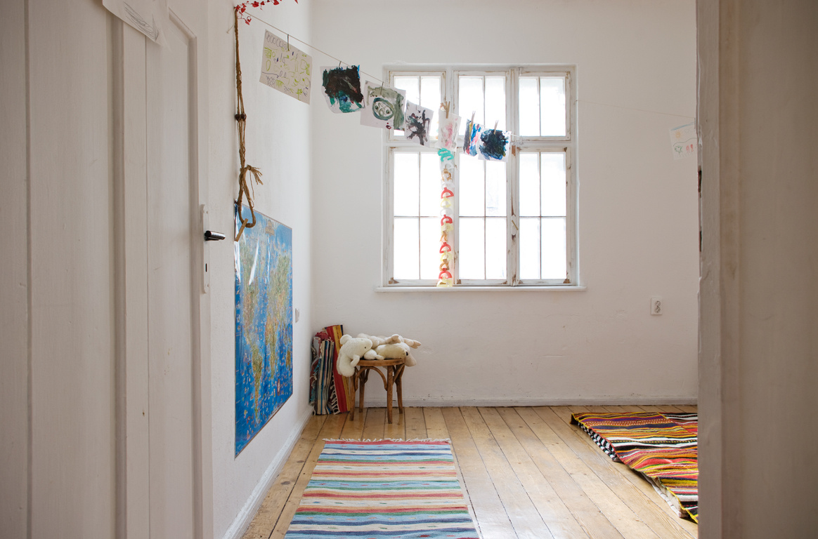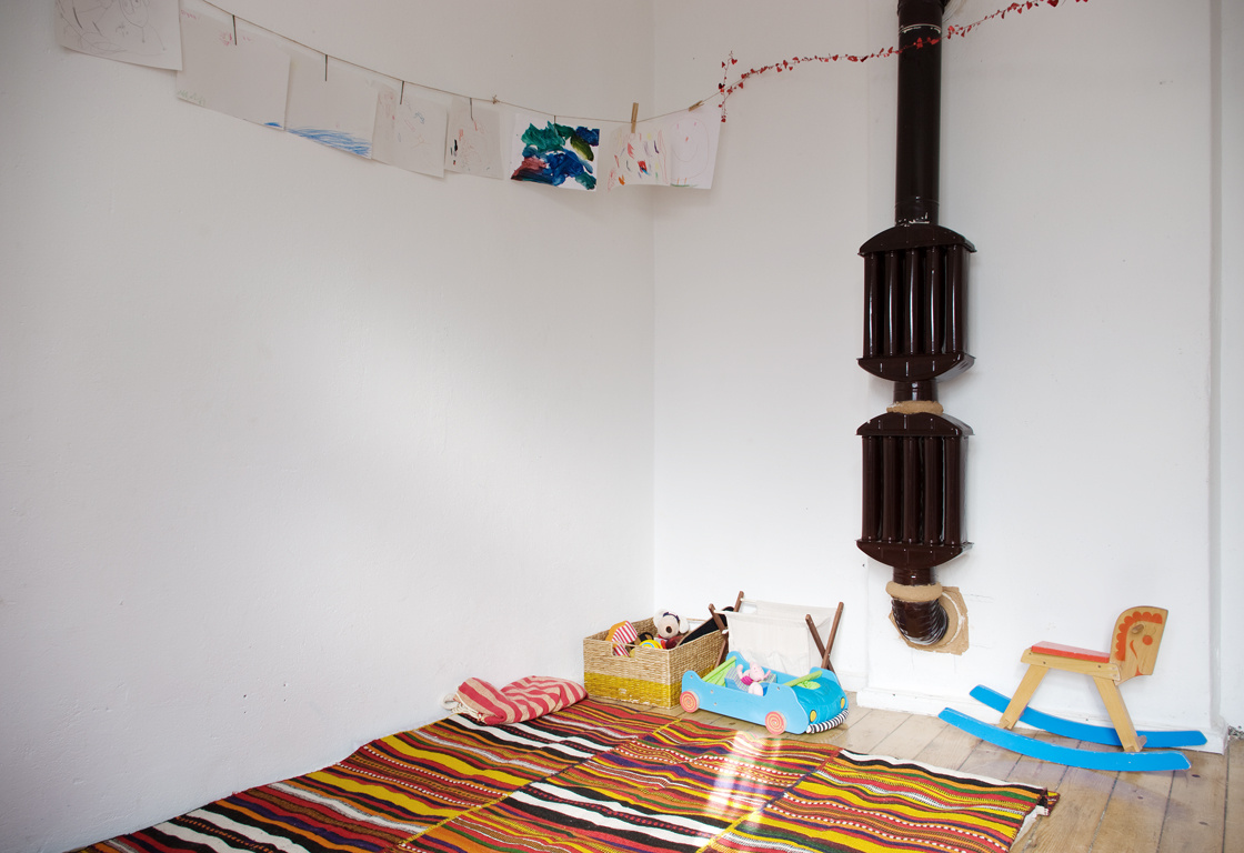 Артистичен и подчертано еко е и интериорът. Къщата е строена в края на 20-те и годините й личат, даже тук-таме умишлено са подчертани - оставили са дюшемето на пода и старата печка в едната стая. Пак там стената е покрита със страници от списание Дъга; Боряна лично ги е „галила" цяла седмица, за де се залепят по-добре. Неин е и дизайнът на кръглата дървена маса, която се разделя на по-малки части и малчуганите си играят с тях на архитекти. Студио Funkt са сглобили кухненския плот, под който има две кофи - една за пластмаса и една за хартия, така че от сега да свикват с разделното събиране на боклука. Повечето столове пък са от работилница Пункт и се продават. Накратко - събрали са оттук-оттам каквото могат и са направили от нищо нещо.